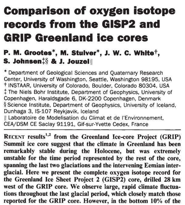 In the early 1990s, independently drilled Greenland ice cores — GRIP and GISP2 — revealed something extraordinary. Their oxygen isotope records showed repeated, large, and rapid climate shifts during the last glacial period. (Grootes et al., 1993)